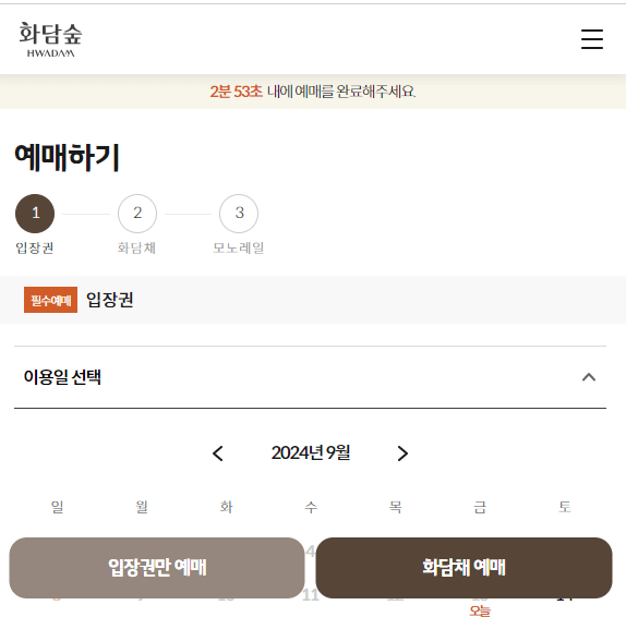 화담숲 온라인 예약은 입장권, 화담채, 모노레일을 예매할 수 있습니다. 먼저 예매시작을 클릭하면 약관동의와 본인인증이 진행됩니다.