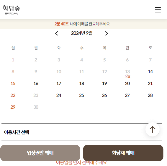 본인인증을 완료하면 예약 가능한 날짜와 시간이 표기됩니다. 성수기에는 예약이 빨리 마감되니 미리 예약하시는 것을 추천드립니다. 예약 내역을 확인한 후, 결제 페이지로 이동하여 결제를 완료합니다.