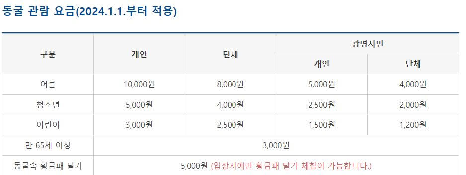 광명동굴은 입장료가 연령 및 조건에 따라 다르게 책정되며, 사전 예매를 통해 더욱 편리하게 방문할 수 있습니다.