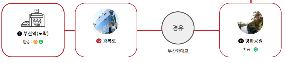 부산역에서 출발하여 다대포 해수욕장 방면의 주요 관광지를 경유하는 코스입니다.