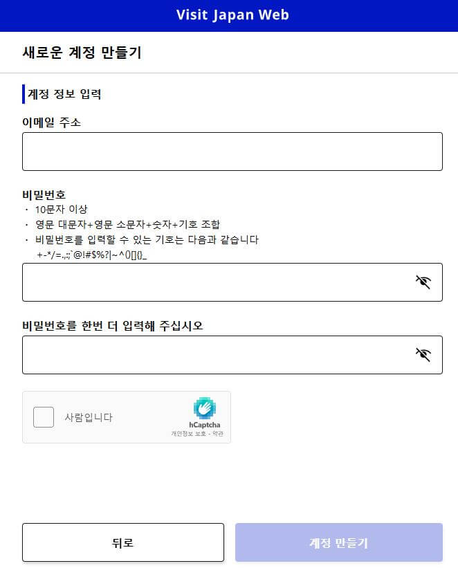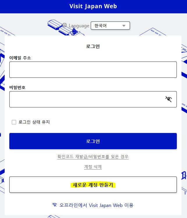 비짓재팬을 사용하기 위해서는 계정을 생성해야 합니다. 상단 메뉴에서 로그인 버튼을 클릭한 후 신규 등록을 선택합니다 이메일 주소를 입력한 후 인증 메일을 통해 계정을 활성화합니다.