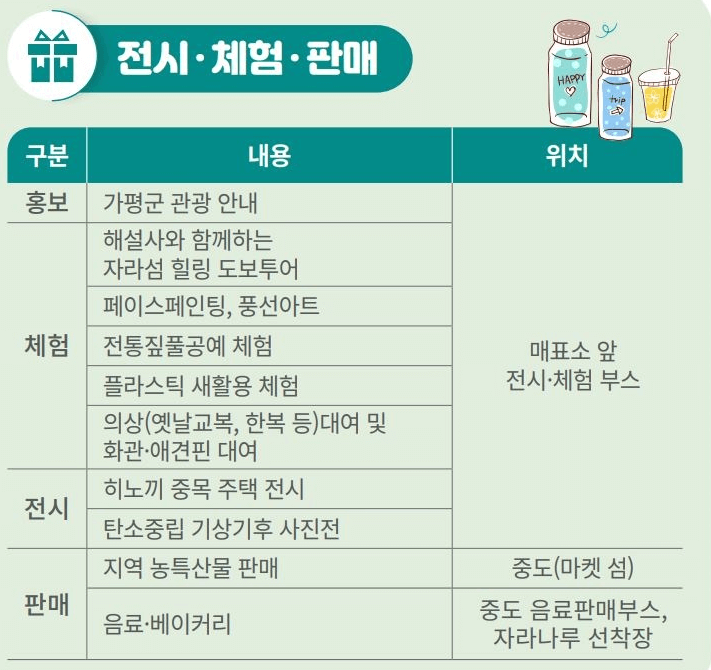 또한 해설사와 함께하는 자라섬 힐링 도보투어와 페이스페인팅, 풍선아트 등 다양한 체험도 준비되어 있습니다.