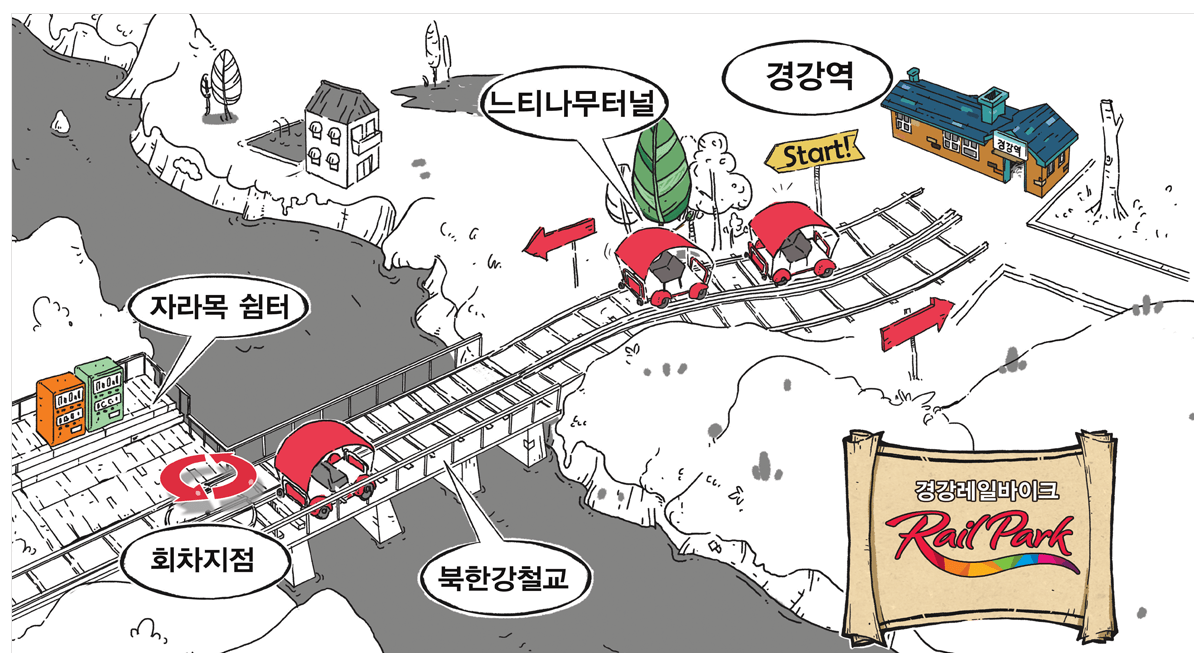 경강 레일바이크 예약하기 경강레일바이크는 영화 편지의 촬영지로 유명한 경강역에서 출발하여 북한강 철교에서 회차, 경강역으로 돌아오는 왕복코스입니다.
