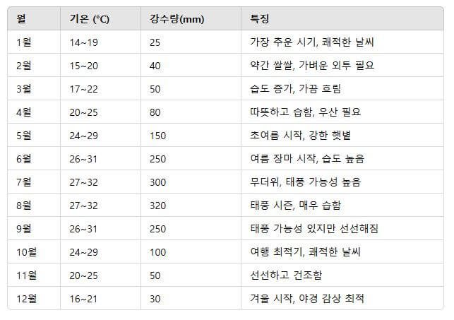 10월~2월이 여행하기 가장 좋은 시기이며, 여름철에는 태풍과 습도를 고려한 일정 조정이 필요합니다